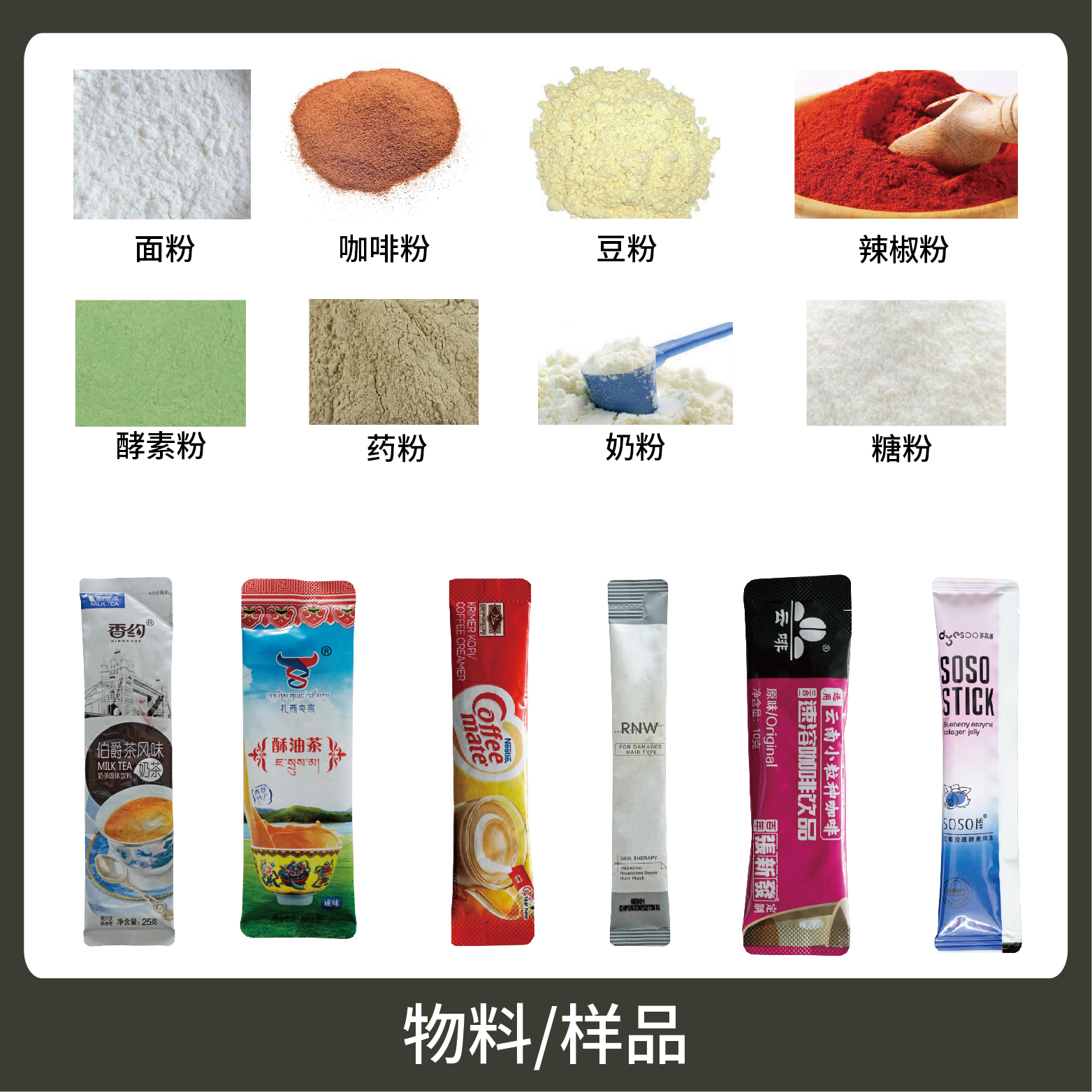 適用于食品、醫(yī)藥、化工、化妝品行業(yè)中粉劑等物品的計量包裝,如:奶粉、藥粉、咖啡粉、蛋白質(zhì)粉等。