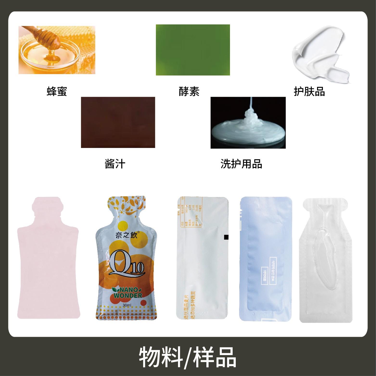 適用于各行業(yè)中酵素、果汁、漱口水、洗護用品、染發(fā)劑、化妝品小樣等醬料、液體物品的雙列異形袋計量包裝。